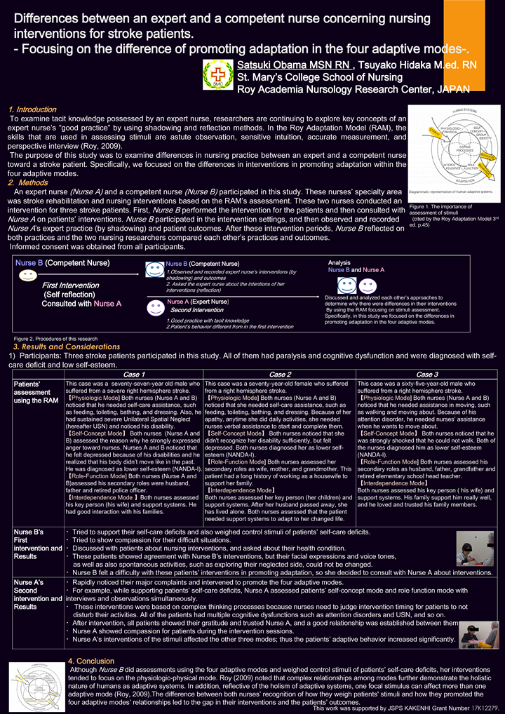 Differences between an expert and a competent nurse with intervention for stroke patients. –Focusing on the difference of promoting adaptation in the four adaptive modes.- ○Satsuki Obama, Tsuyako Hidaka