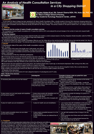 An analysis of health consultation services in a city shopping district. ○Tsuyako Hidaka, Satsuki Obama, Nobu Ide.